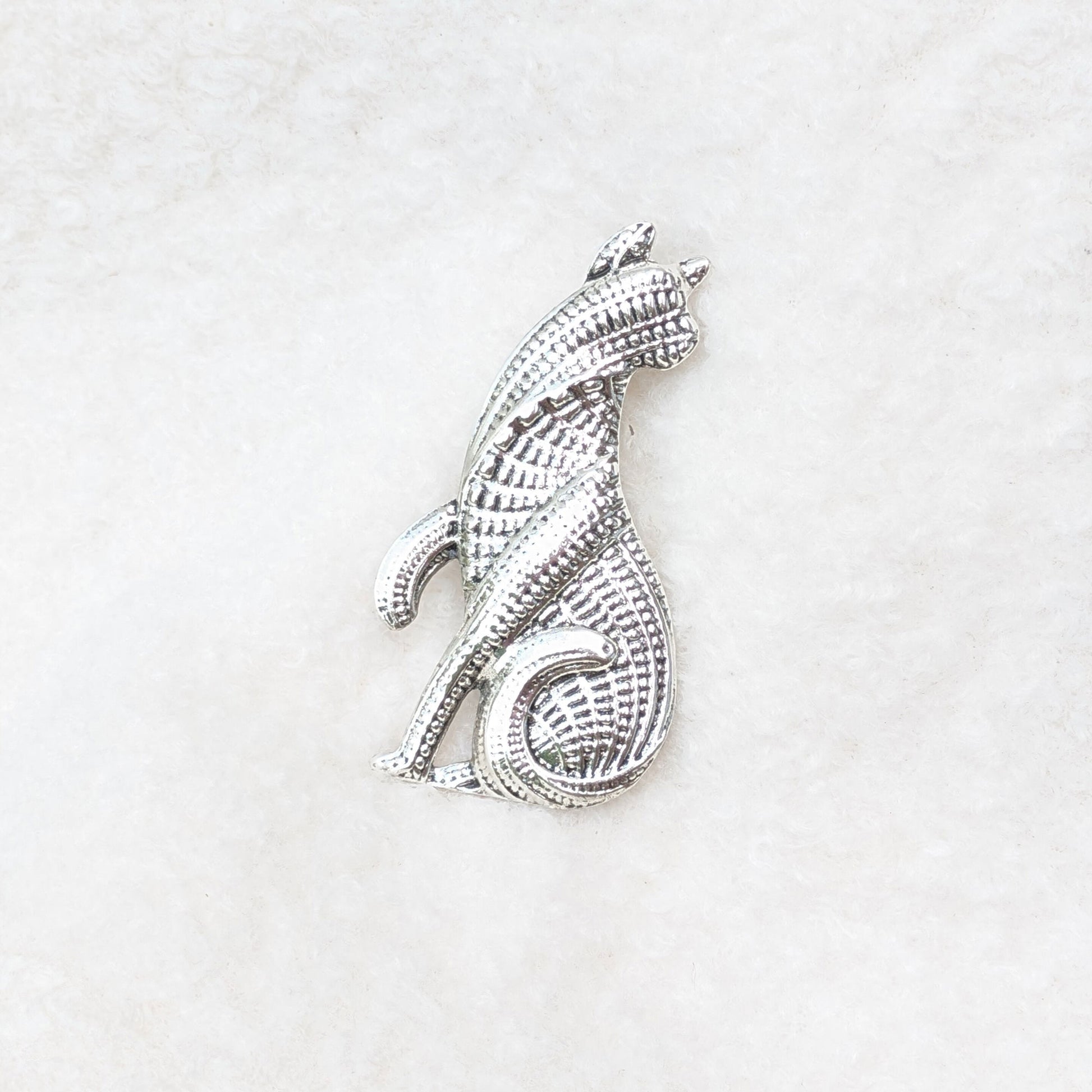 Depicting a seated cat turning elegantly to look over it's shoulder, this brooch measures approximately 7cm high x 4cm wide (2 .75" by 1.5") and is available in a silver plated or gold plated finish.
