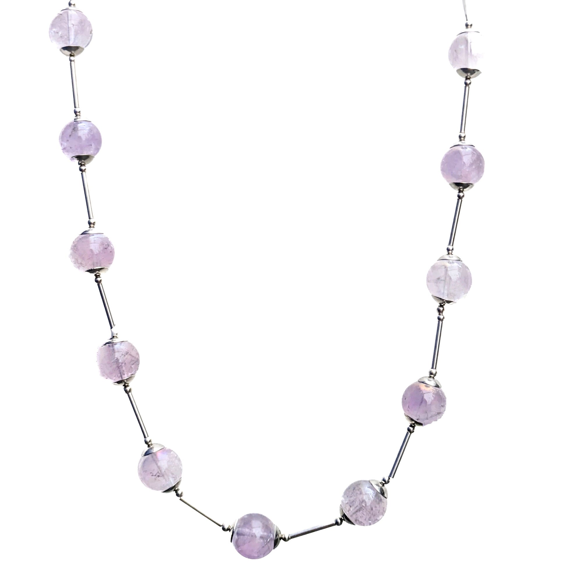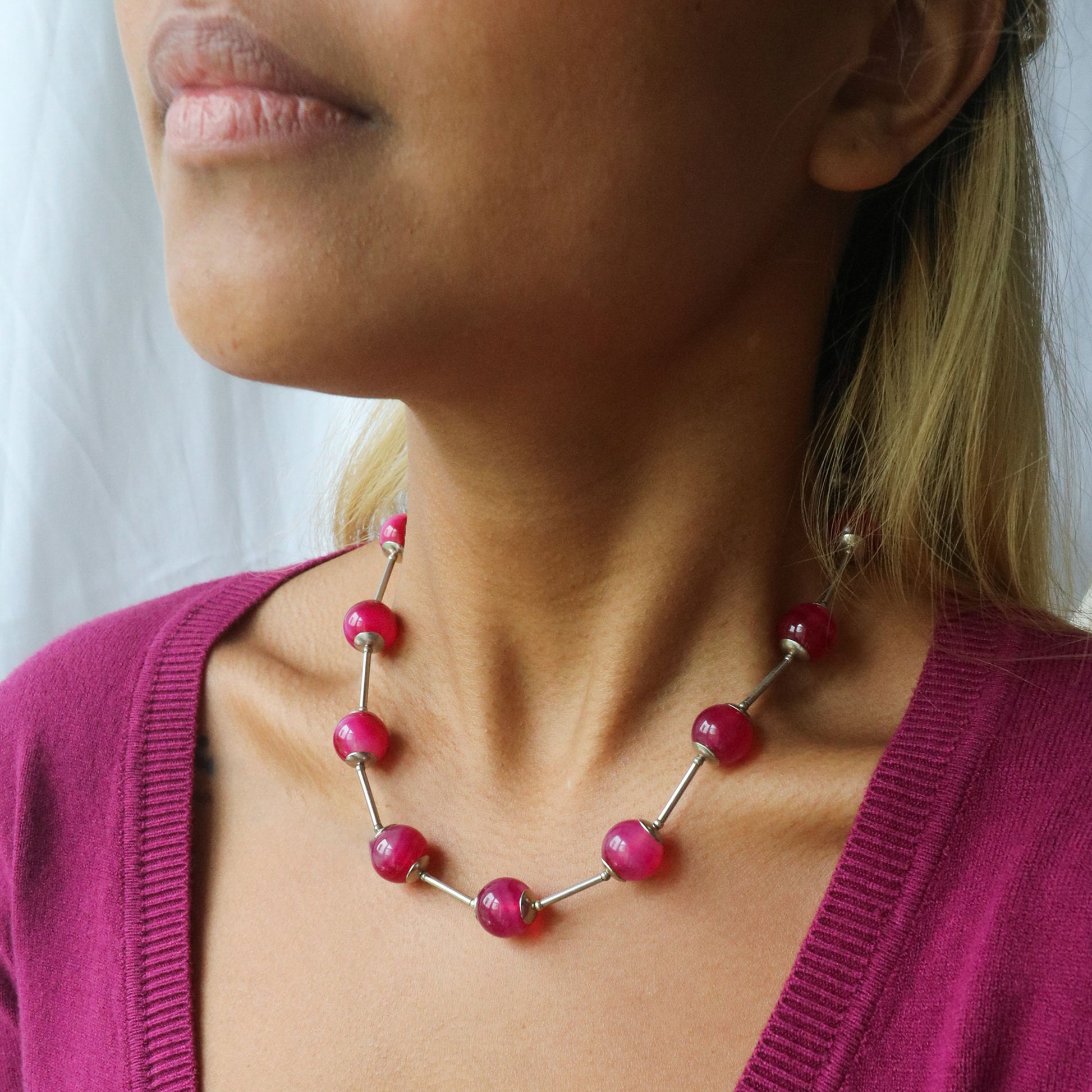 This necklace in our signature orb design is handmade and available in a range of colours and semi-precious stones. It fastens at the back with a silver plated T-bar clasp.
