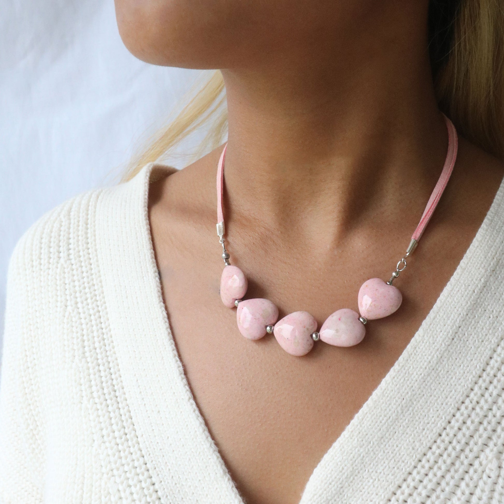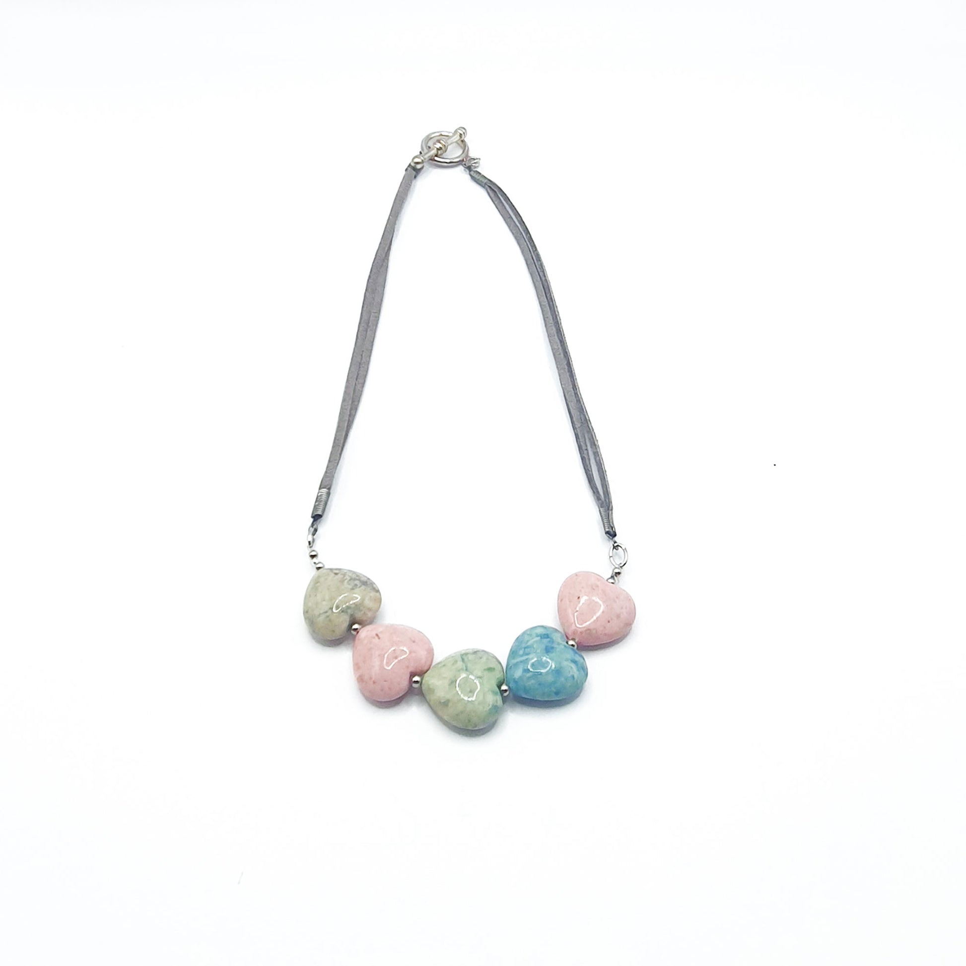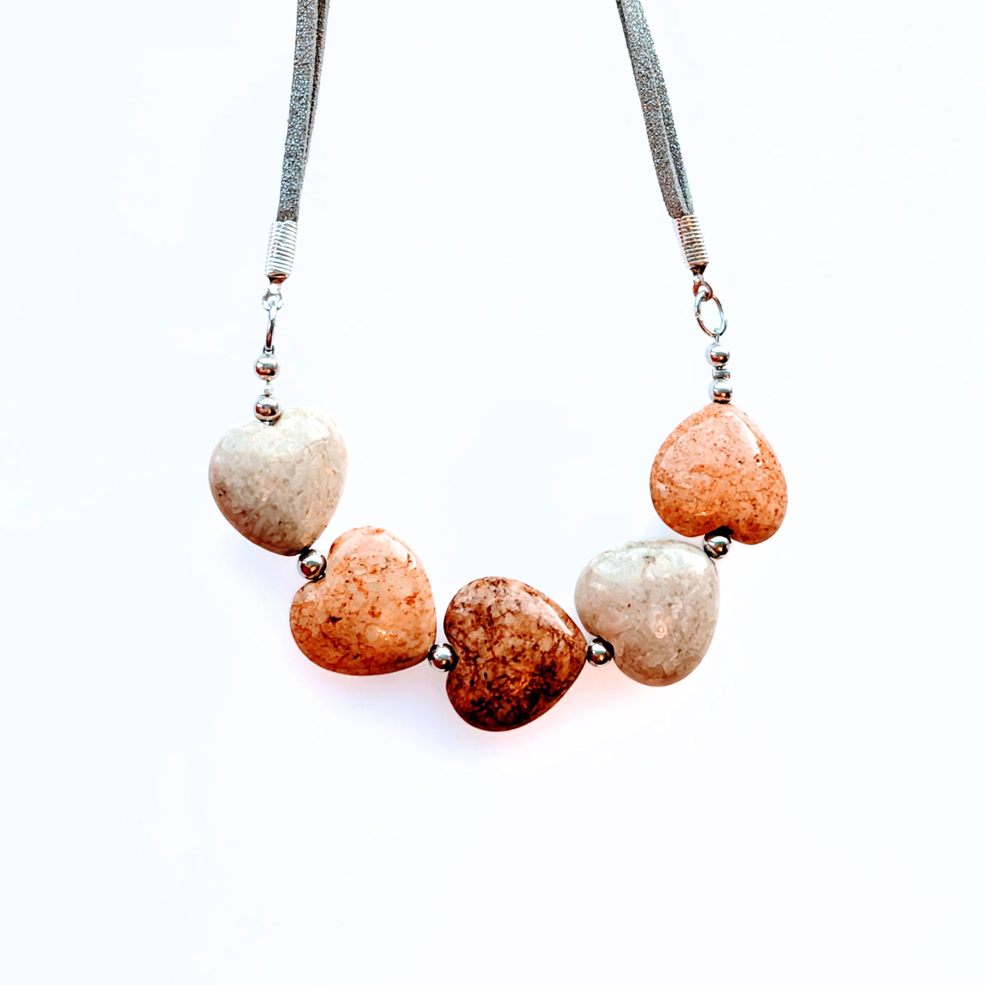 A row of five fossil hearts in a variety of shades set on a flat soft cord, with a silver plated T-bar clasp.