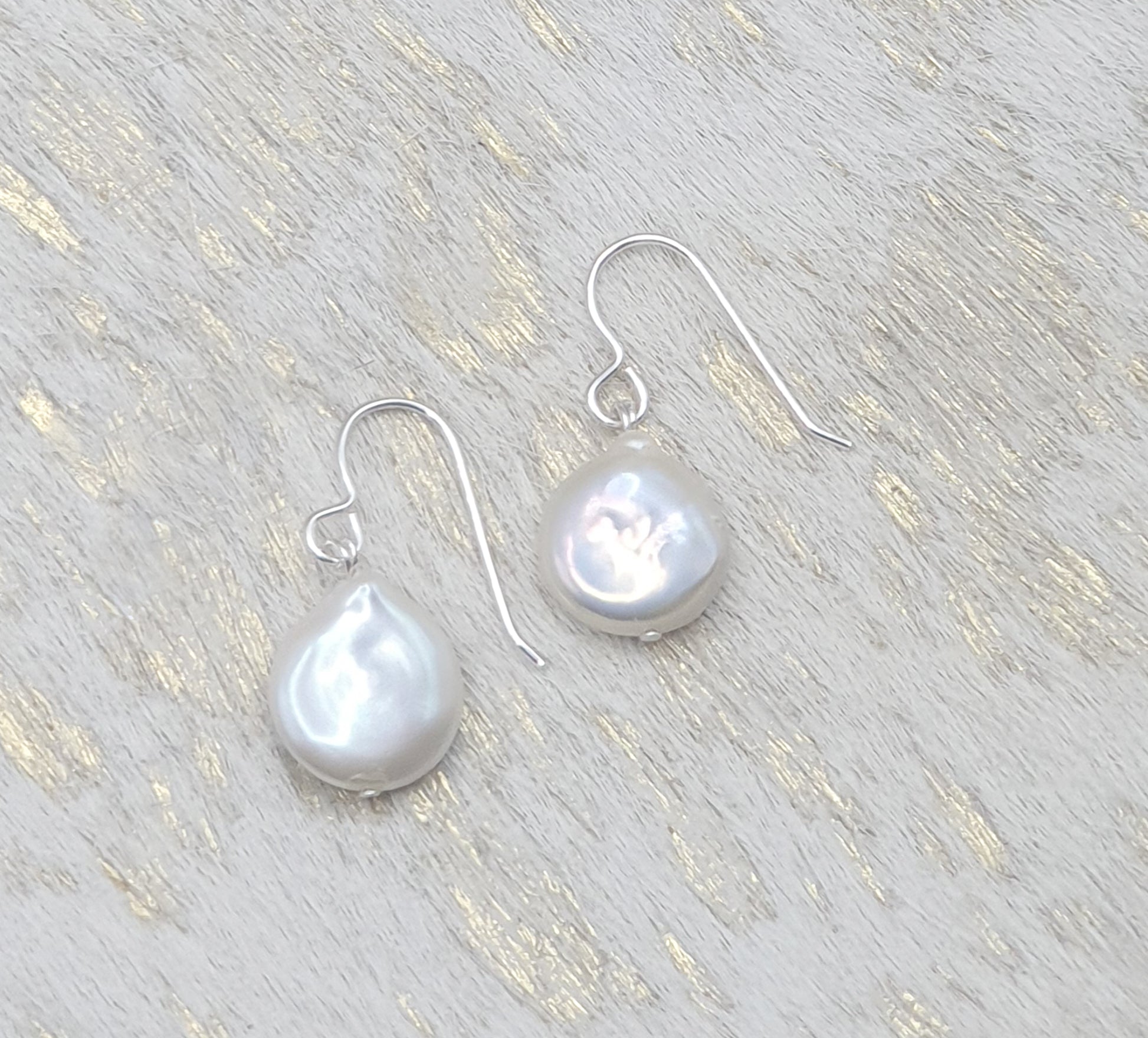 Beautiful and slightly irregular freshwater coin pearls on sterling silver ear wires.