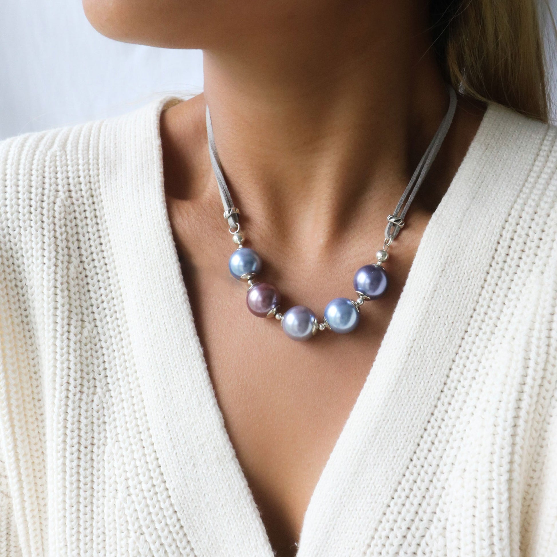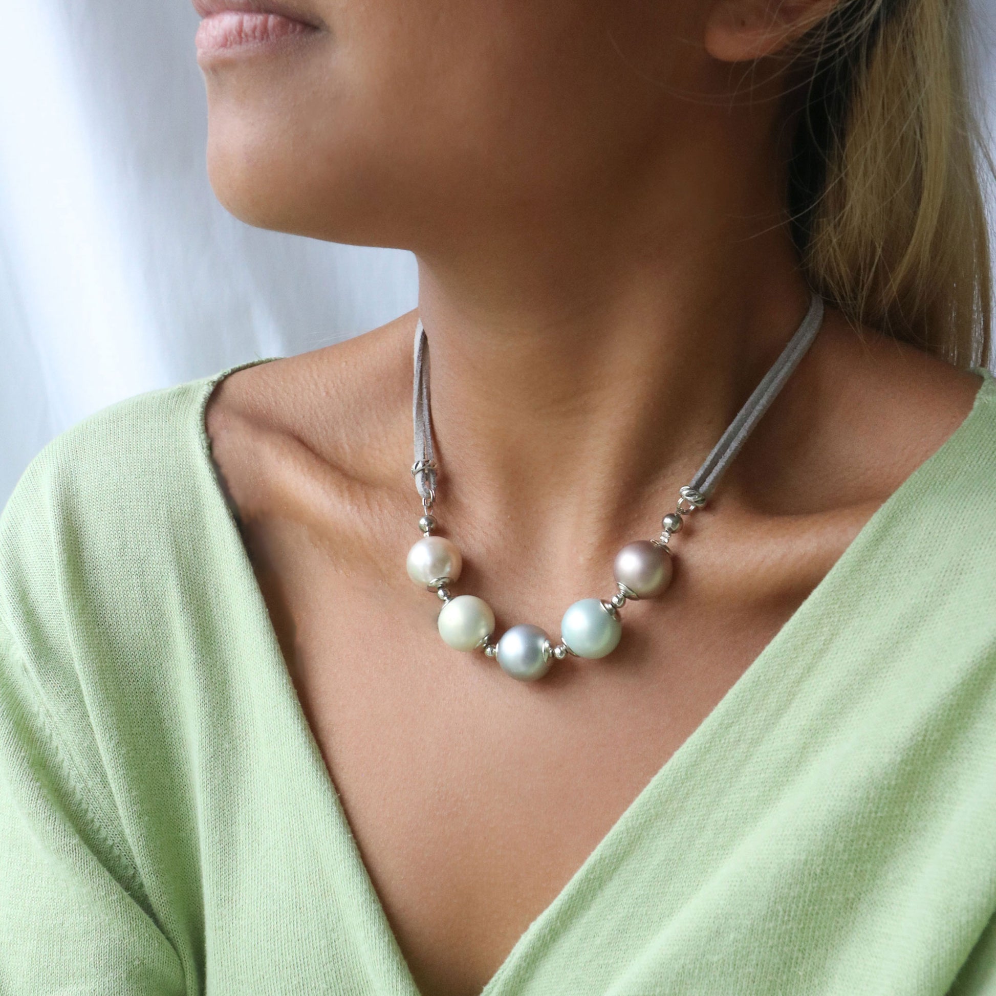 Beautifully coloured glass pearls bring a splash of colour.  The cord is of faux suede with a T-bar clasp.