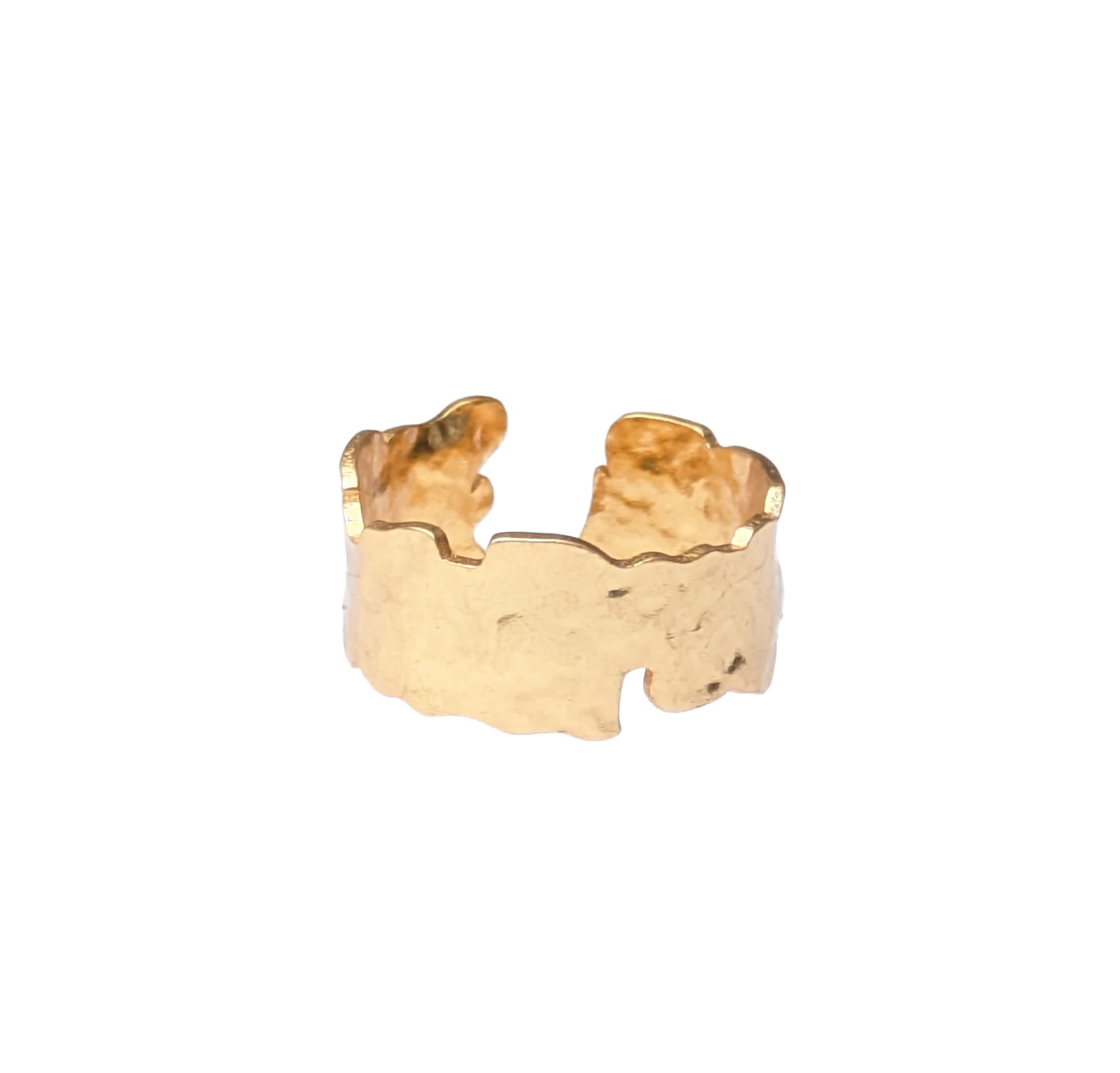 This lovely ring is rregular is shape with a hammered finish. It is made of brass plated with 18ct gold. With an Etruscan feel it is open at the back and slightly adjustable.