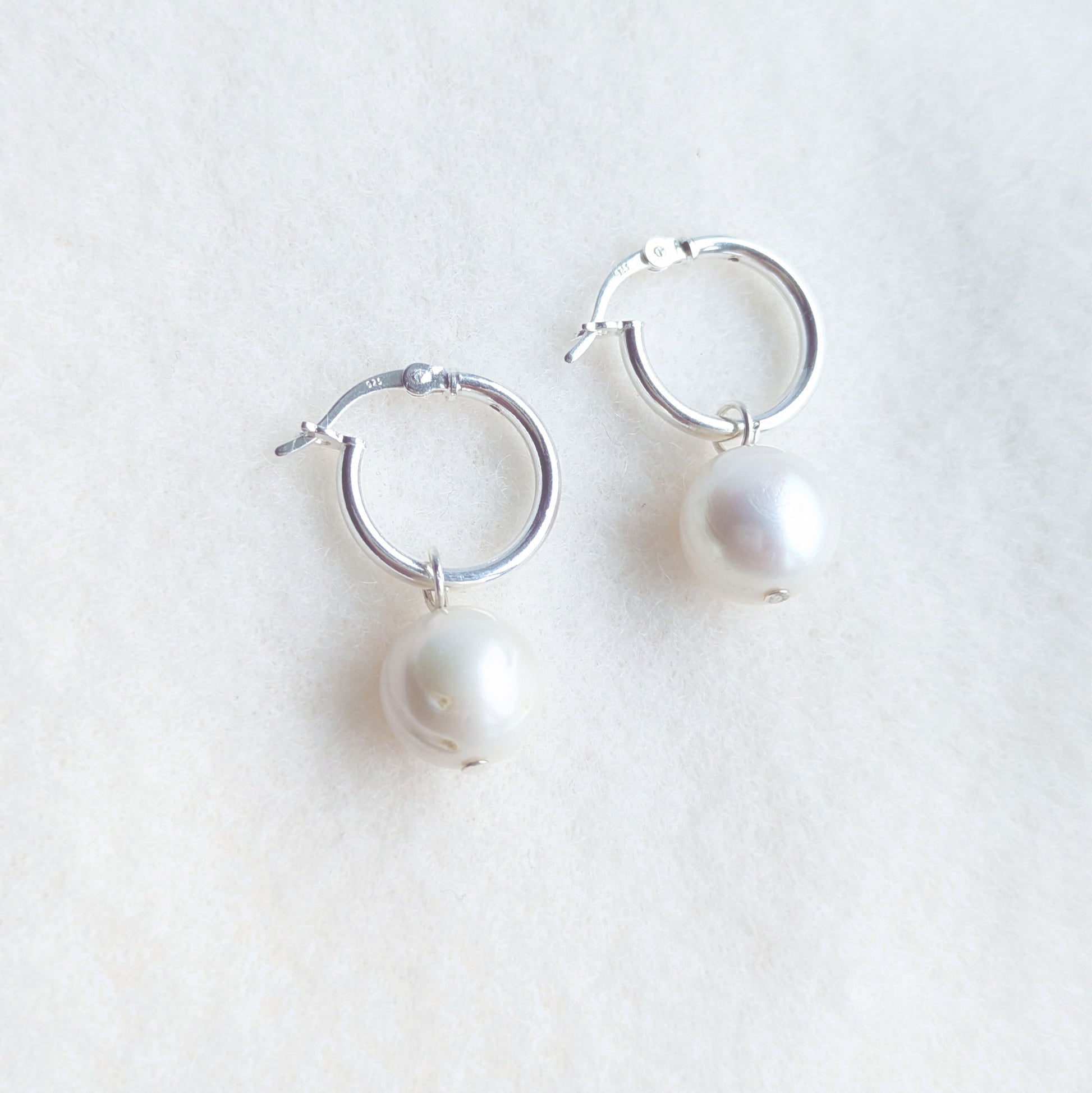 15mm hinged sleeper-style hoop with a freshwater pearl drop. Available in sterling silver or with 24ct gold vermeil (gold plated sterling silver) finish. Gold vermeil is extra durable and is the highest quality demi-fine jewellery.