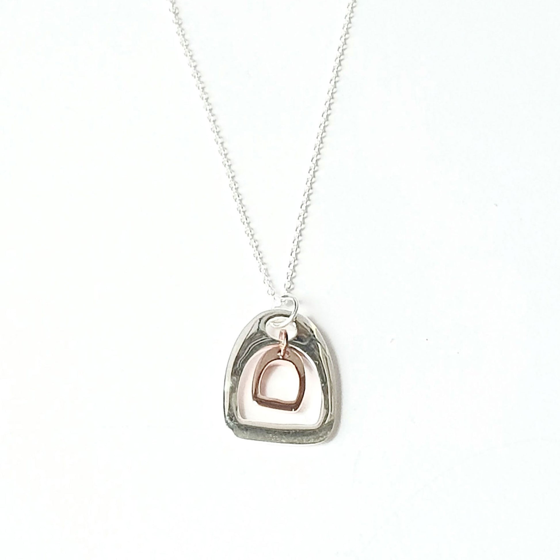 A lovely little necklace in sterling silver and rose gold plated. One stirrup sits inside the other for a signature look. If shown as "out of stock" please call or email as it may be available very quickly.