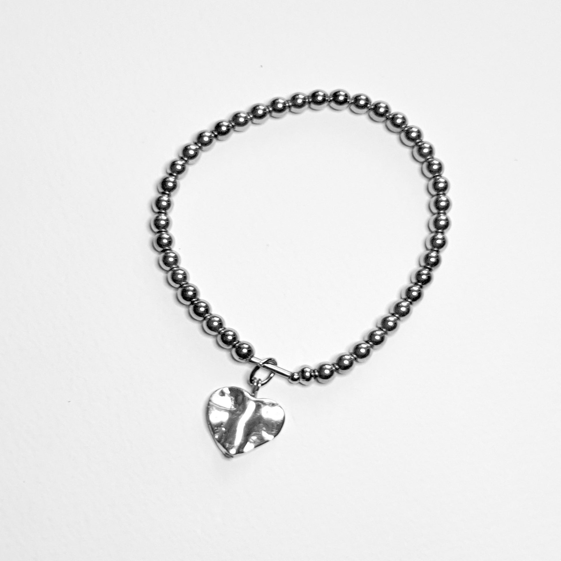 Silver plated wavy heart charm on a strong elasticated band of hematine.